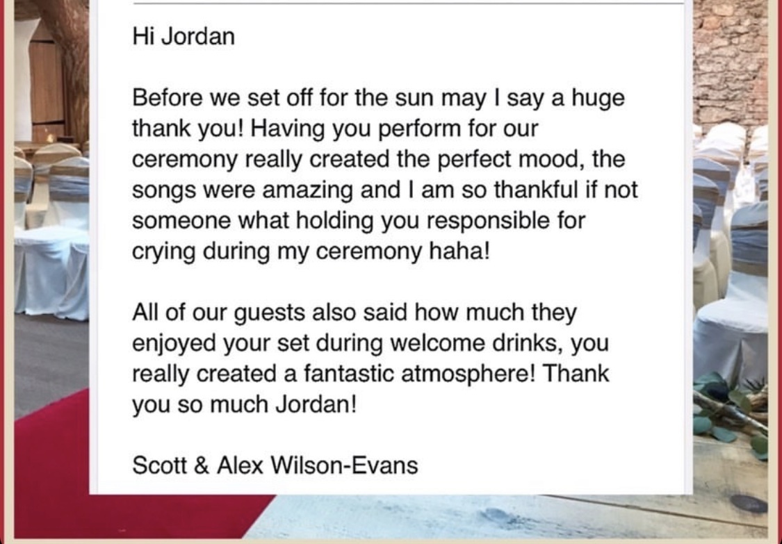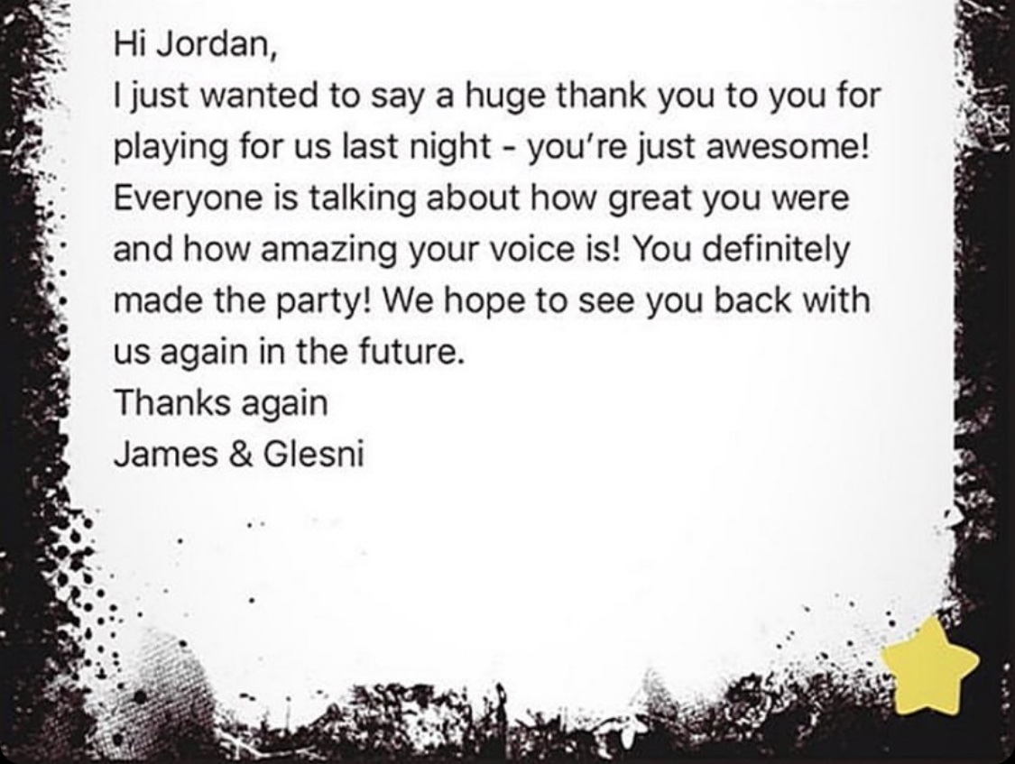 'Jordan was incredible, Voice outstanding, really interactive and knew the audience. Will be booking again!