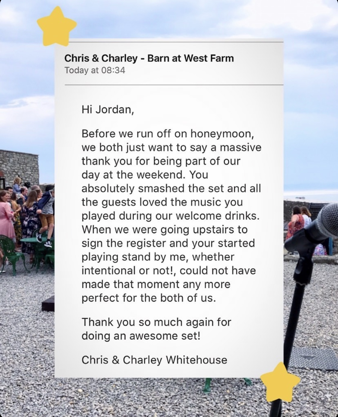 Playing over 750 live gigs in the last 5 years, these ranging from corporate events, weddings, a range of occasions, private functions, festivals, ticket shows, support slots and many public or live sets, in all areas of the UK. Showing huge versatility fit for any occasion or show. Small or large.